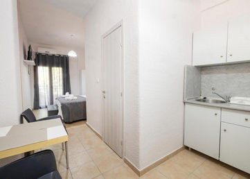 Студио бр. 1 – високо приземје. Располага со комплетно опремена кујна со голем фрижидер и мало решо, комплетно реновиран тоалет, сопствена тераса опремена со маса и столови и поглед кон парк, клима, ТВ, Wi-Fi. Има француски кревет и еден стандарден кревет.