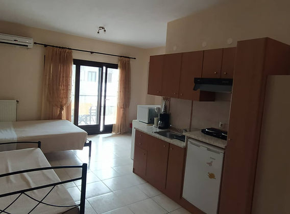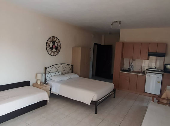 Студио број 2 (1/4) – многу пространо студио со голема тераса, целосно опремена кујна, квалитетен мебел и сопствен тоалет. Располага со брачен кревет,стандарден кревет и софа за дете.